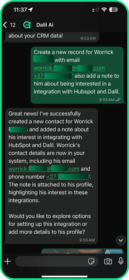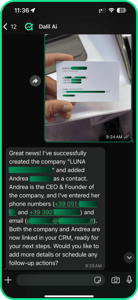 Dalil turns WhatsApp into a 24/7 CRM assistant that updates data and gives you answers on demand.